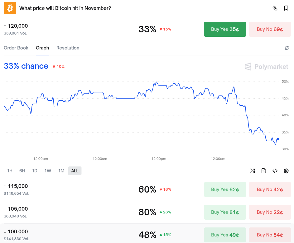 Tahmin piyasaları, kripto para yatırımcıları arasındaki mevcut düşük duyarlılığı vurguluyor. Polymarket, BTC/USD’nin ayı 120.000 doların üzerinde kapatma olasılığının yalnızca %33 olduğunu tahmin ediyor; 115.000$ için bu oran %60’tır.