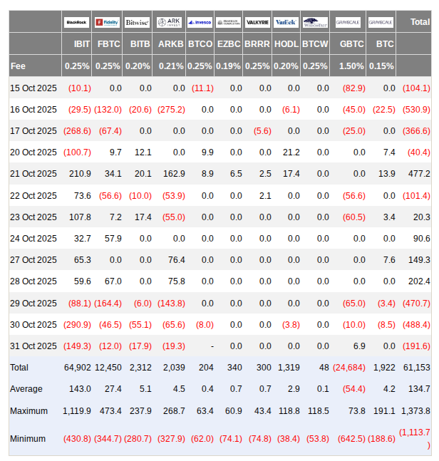 İngiltere merkezli yatırım şirketi Farside Investors’ın verileri, ABD spot Bitcoin borsa yatırım fonlarından (ETF’ler) 31 Ekim’e kadar art arda üç gün boyunca net çıkışlar olduğunu gösteriyor.